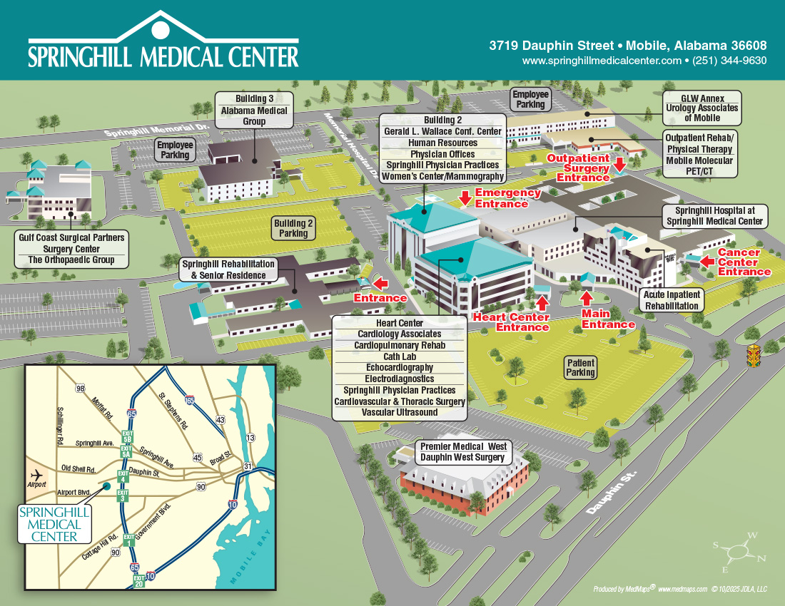You may park in any of the yellow highlighted areas shown on this map closest to the area of the hospital you wish to access. Please do not park in places with signs designated for physicians, clergy, physically impaired, or other reserved parking spaces. A van driven by our security personnel travels the lots on a regular basis and can take you to any of the buildings on the Springhill Medical Center campus.